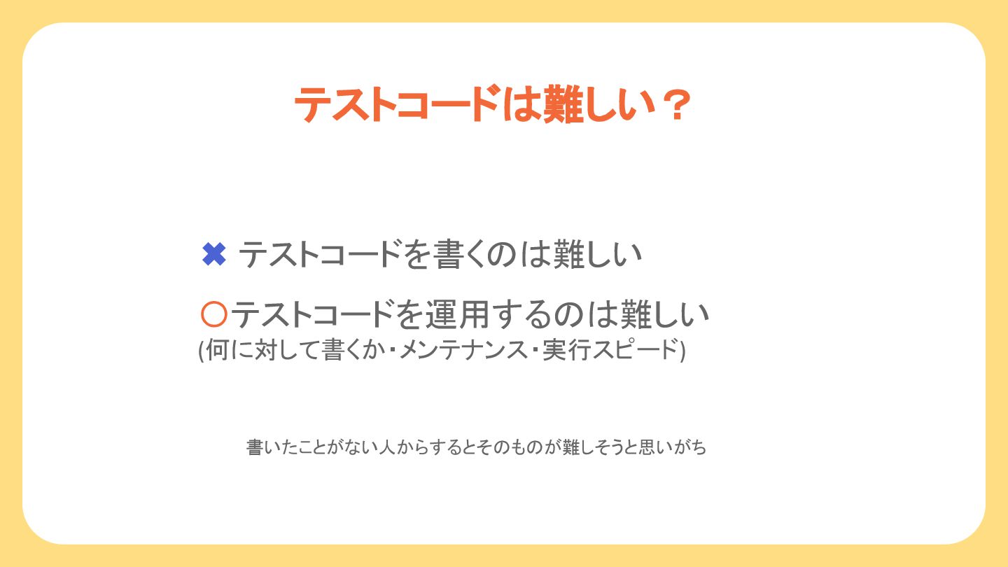 テストコードは難しい? ✖ テストコードを書くのは難しい 〇テストコードを運用するのは難しい (何に対して書くか・メンテナンス・実行スピード) 書いたことがない人からするとそのものが難しそうと思いがち