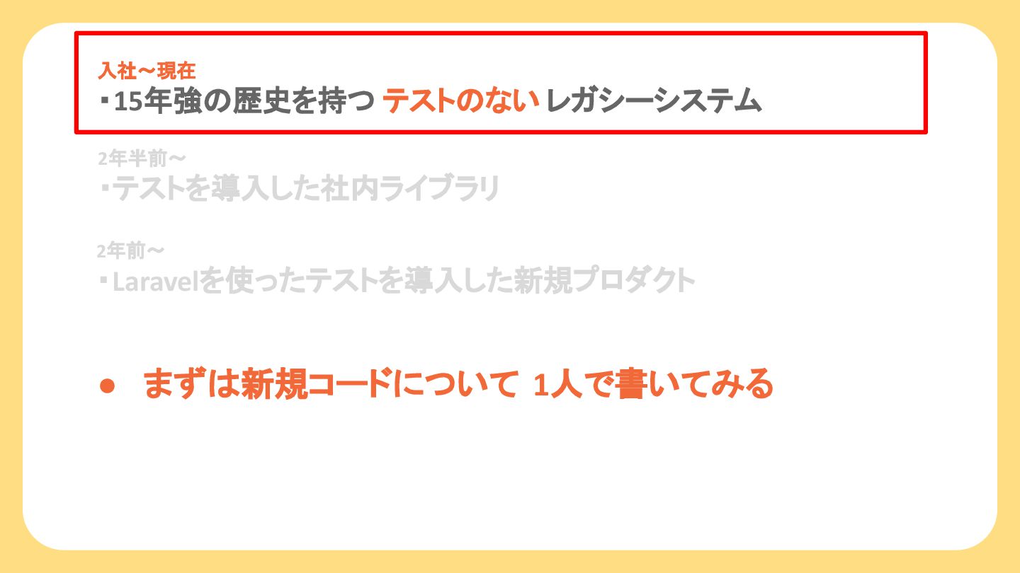 入社~現在 ・15年強の歴史を持つ テストのない レガシーシステム 2年前~ ・Laravelを使ったテストを導入した新規プロダクト 2年半前~ ・テストを導入した社内ライブラリ • まずは新規コードについて