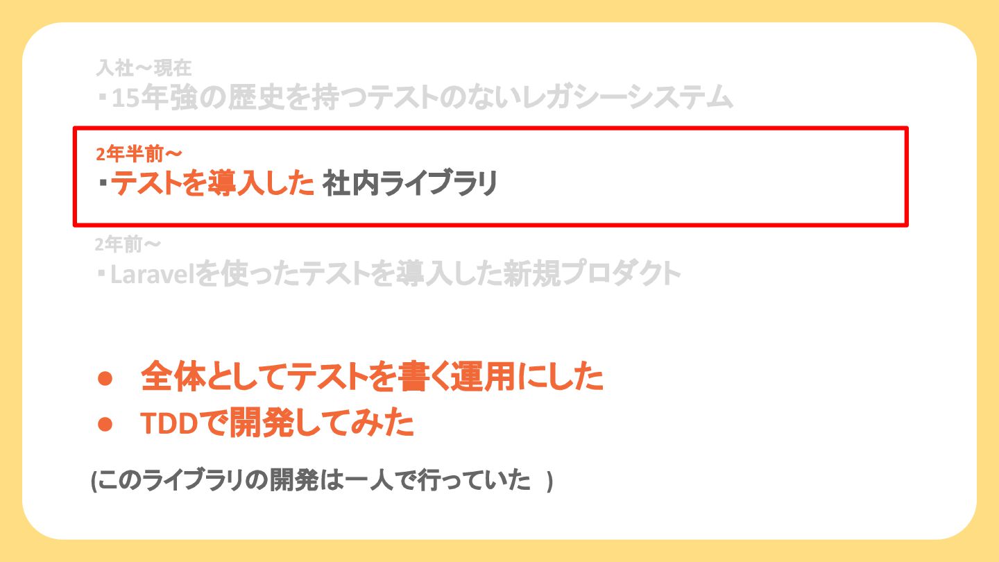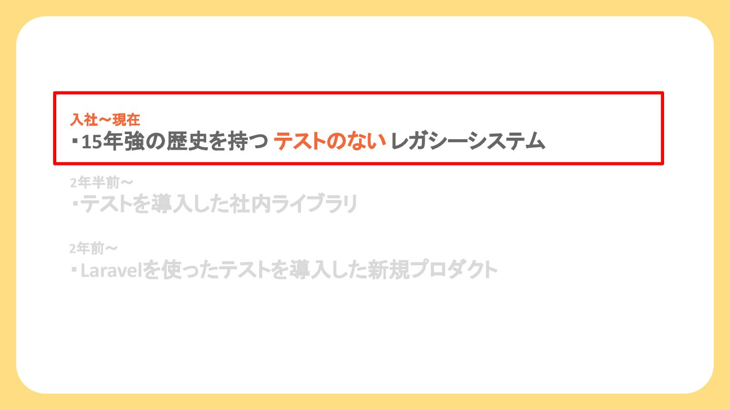 入社~現在 ・15年強の歴史を持つ テストのない レガシーシステム 2年前~ ・Laravelを使ったテストを導入した新規プロダクト 2年半前~ ・テストを導入した社内ライブラリ