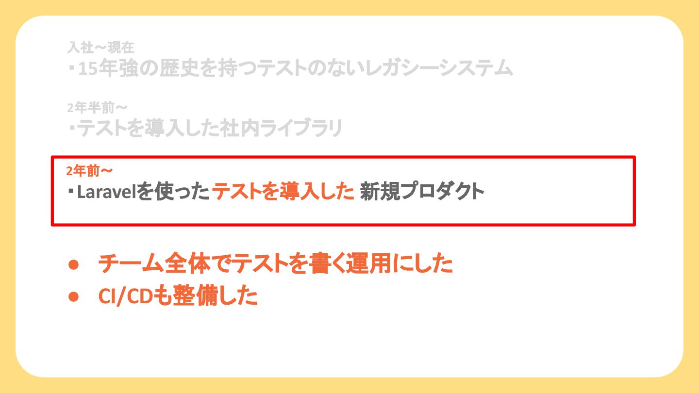 入社~現在 ・15年強の歴史を持つテストのないレガシーシステム 2年前~ ・Laravelを使ったテストを導入した新規プロダクト 2年半前~ ・テストを導入した 社内ライブラリ • 全体としてテストを書く運用にした •