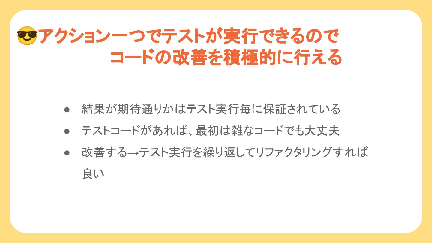 😎アクション一つでテストが実行できるので コードの改善を積極的に行える • 結果が期待通りかはテスト実行毎に保証されている • テストコードがあれば、最初は雑なコードでも大丈夫 • 改善する→テスト実行を繰り返してリファクタリングすれば 良い