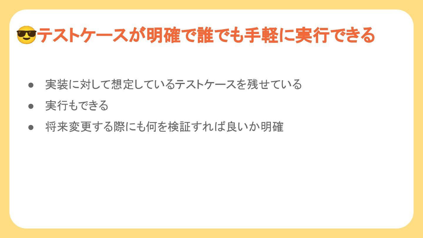 😎テストケースが明確で誰でも手軽に実行できる • 実装に対して想定しているテストケースを残せている • 実行もできる • 将来変更する際にも何を検証すれば良いか明確