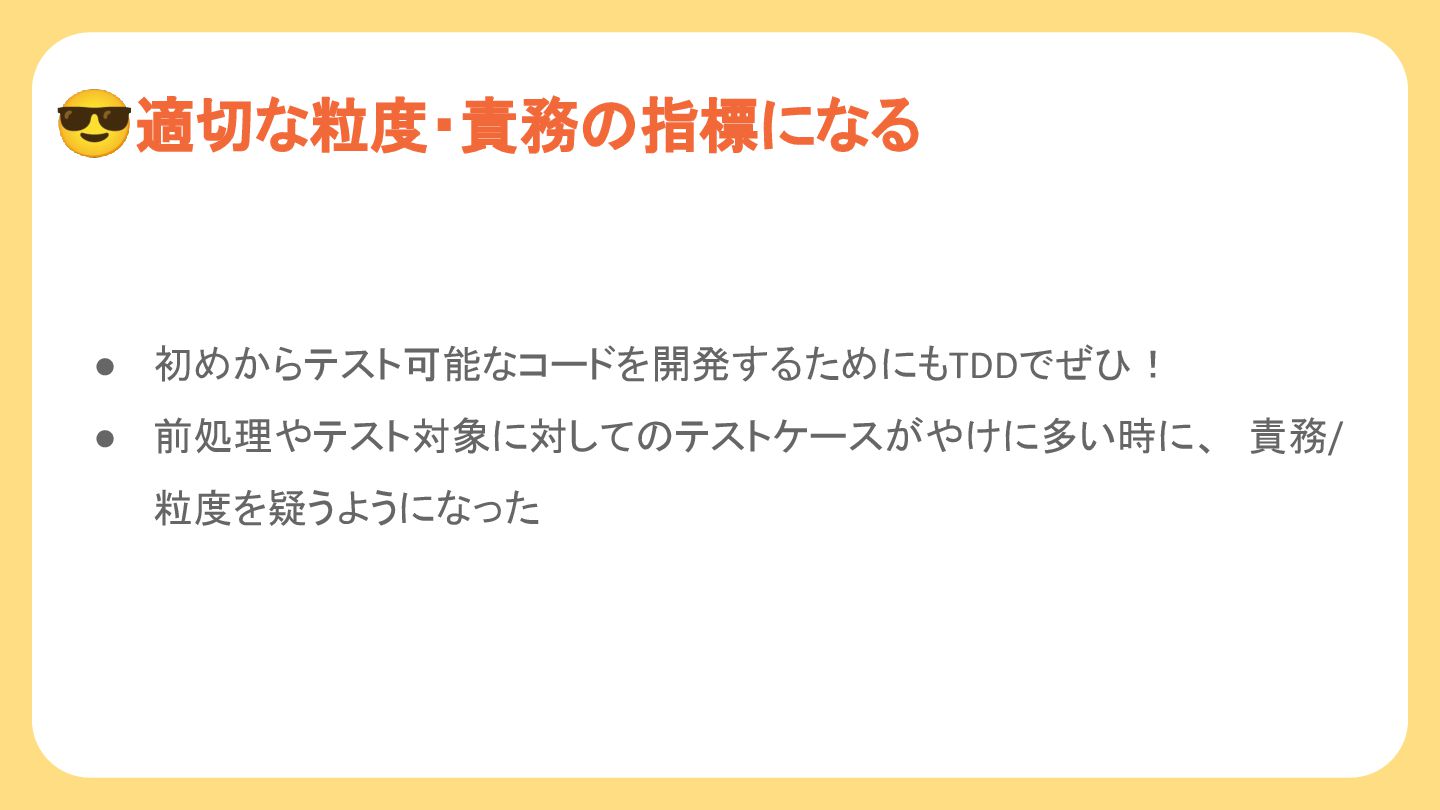 😎適切な粒度・責務の指標になる • 初めからテスト可能なコードを開発するためにもTDDでぜひ! • 前処理やテスト対象に対してのテストケースがやけに多い時に、 責務/ 粒度を疑うようになった