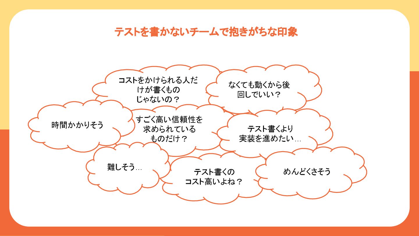 テスト書くより 実装を進めたい… 難しそう… 時間かかりそう めんどくさそう テストを書かないチームで抱きがちな印象