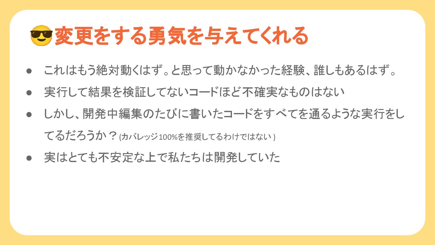 😎変更をする勇気を与えてくれる • これはもう絶対動くはず。と思って動かなかった経験、誰しもあるはず。 • 実行して結果を検証してないコードほど不確実なものはない • しかし、開発中編集のたびに書いたコードをすべてを通るような実行をし てるだろうか?(カバレッジ100%を推奨してるわけではない )