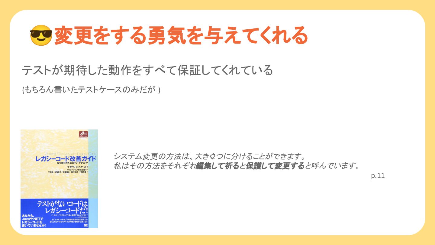 システム変更の方法は、大きく 2つに分けることができます。 私はその方法をそれぞれ編集して祈ると保護して変更すると呼んでいます。 p.11 テストが期待した動作をすべて保証してくれている (もちろん書いたテストケースのみだが ) 😎変更をする勇気を与えてくれる