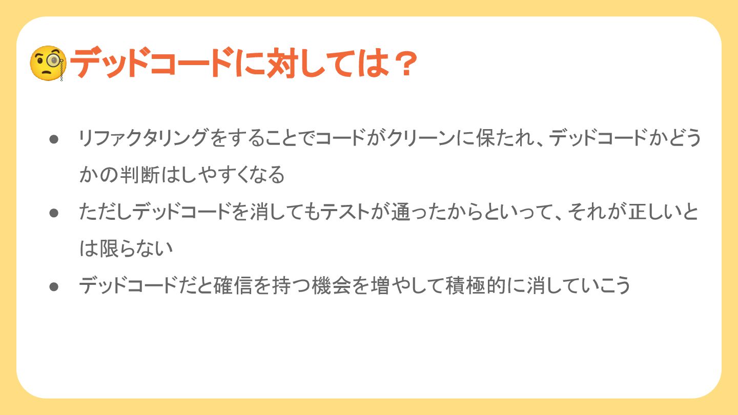 🧐デッドコードに対しては? • リファクタリングをすることでコードがクリーンに保たれ、デッドコードかどう かの判断はしやすくなる • ただしデッドコードを消してもテストが通ったからといって、それが正しいと は限らない • デッドコードだと確信を持つ機会を増やして積極的に消していこう