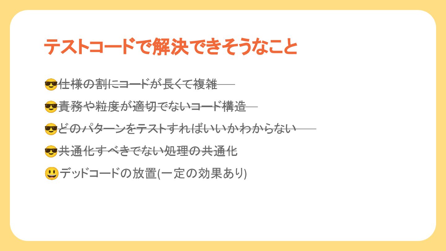 テストコードで解決できそうなこと 😎仕様の割にコードが長くて複雑 😎責務や粒度が適切でないコード構造 😎どのパターンをテストすればいいかわからない 😎共通化すべきでない処理の共通化 😃デッドコードの放置(一定の効果あり)