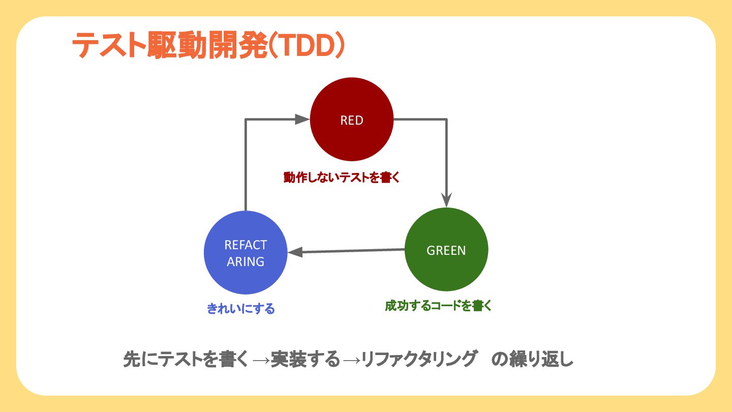 テスト駆動開発(TDD) 先にテストを書く →実装する→リファクタリング の繰り返し RED GREEN REFACT ARING 成功するコードを書く きれいにする