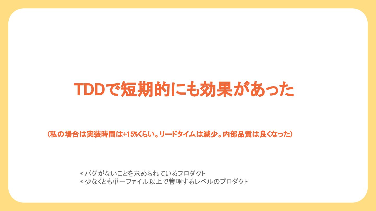 TDDで短期的にも効果があった *バグがないことを求められているプロダクト *少なくとも単一ファイル以上で管理するレベルのプロダクト (私の場合は実装時間は+15%くらい。リードタイムは減少。内部品質は良くなった)