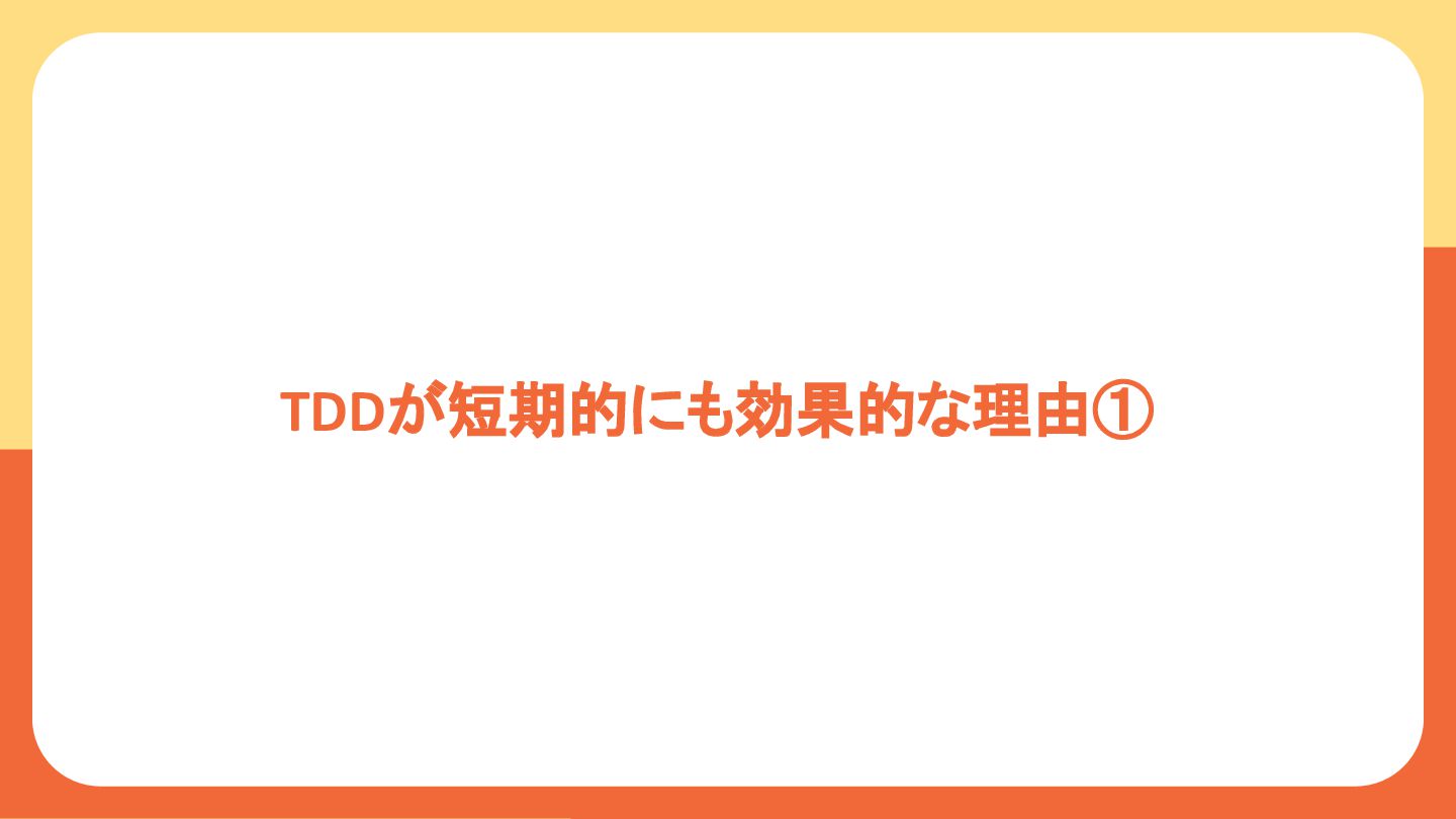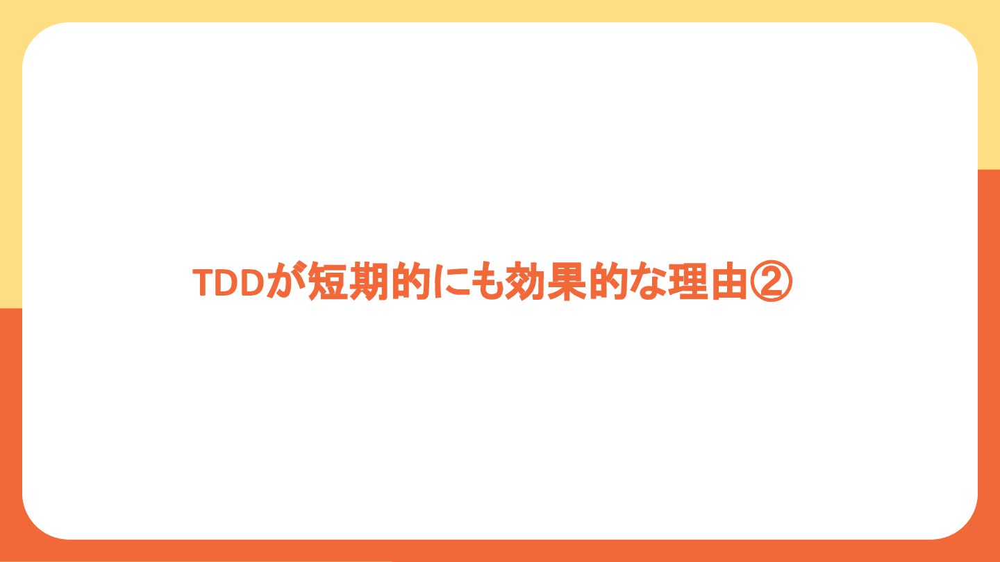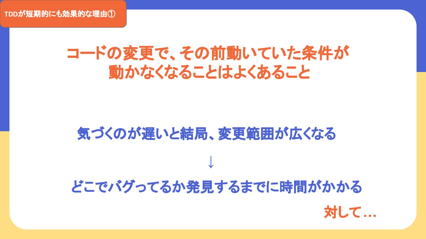 コードの変更で、その前動いていた条件が 動かなくなることはよくあること 気づくのが遅いと結局、変更範囲が広くなる ↓ どこでバグってるか発見するまでに時間がかかる 対して… TDDが短期的にも効果的な理由①