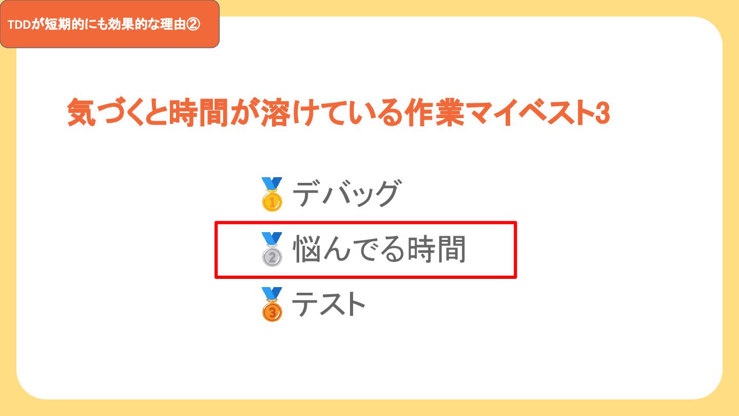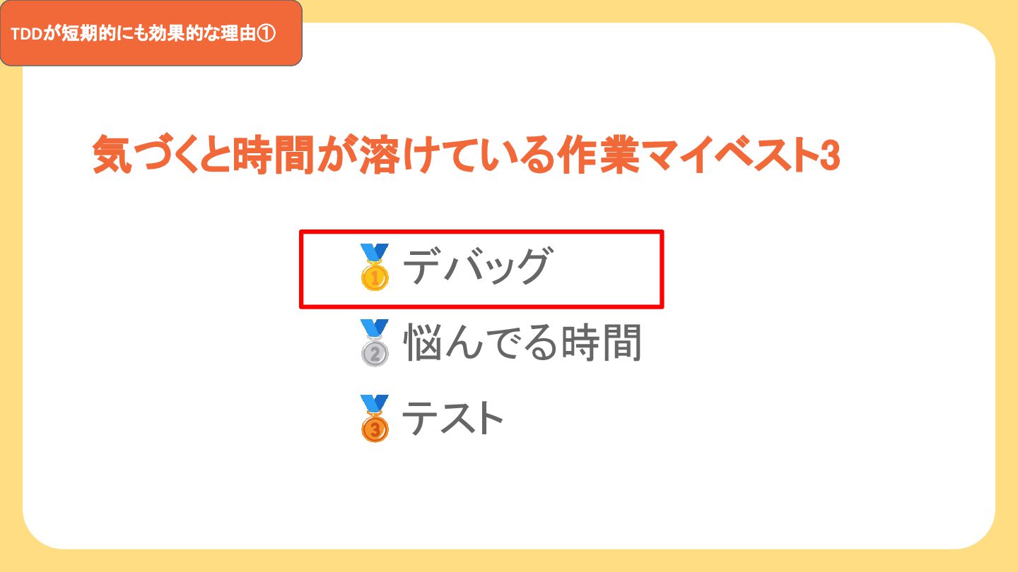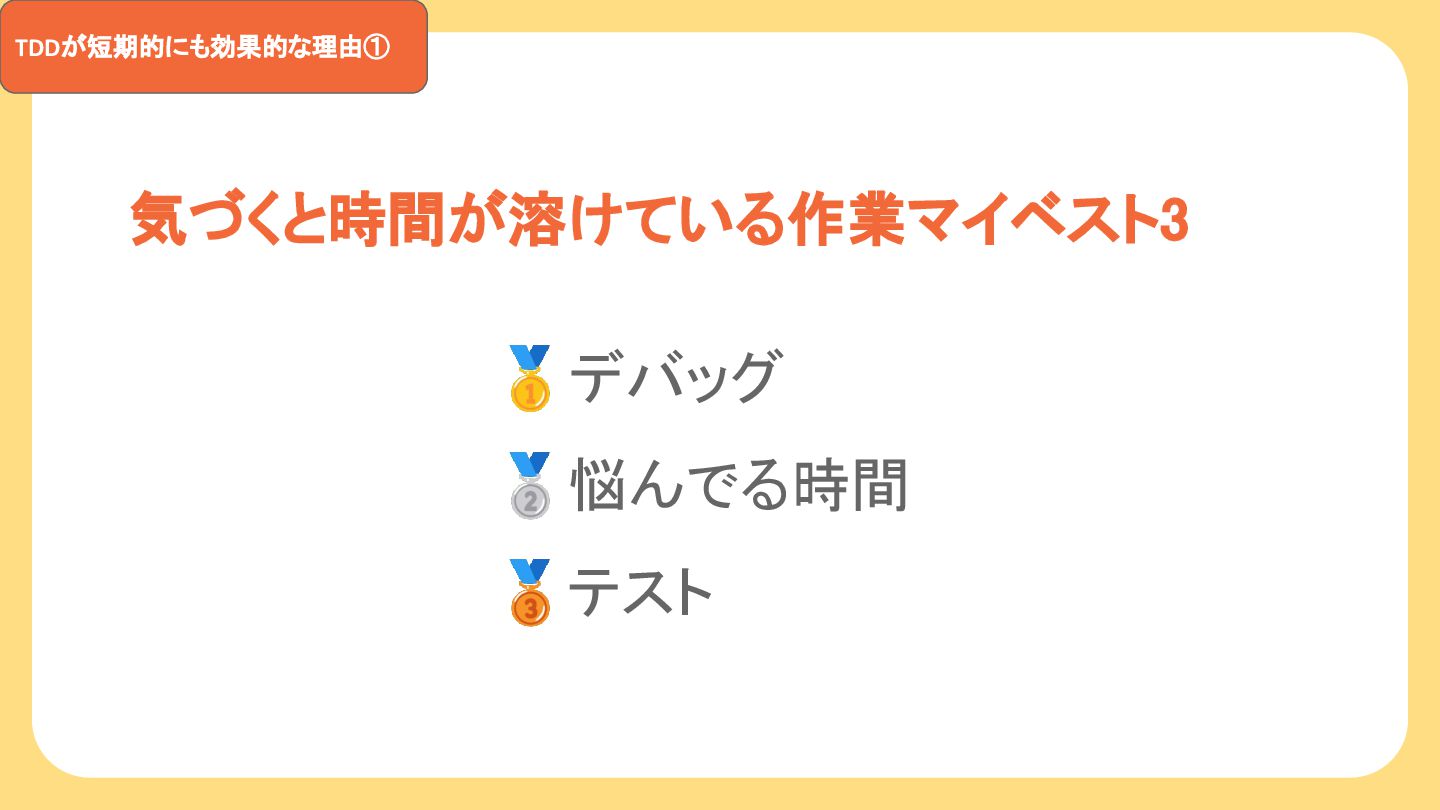 気づくと時間が溶けている作業マイベスト3 🥇デバッグ 🥈悩んでる時間 🥉テスト TDDが短期的にも効果的な理由②