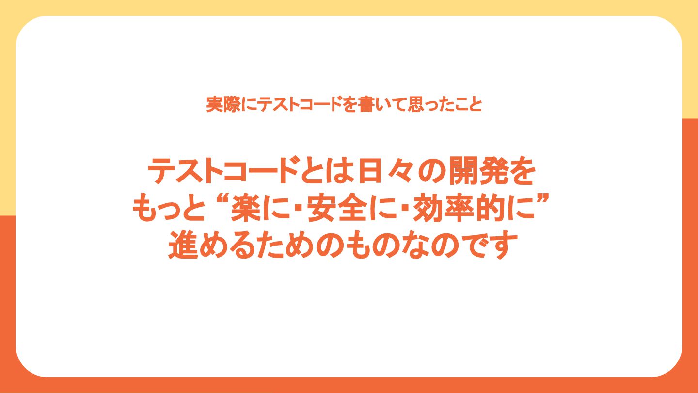 実際にテストコードを書いて思ったこと テストコードとは日々の開発を もっと “楽に・安全に・効率的に” 進めるためのものなのです