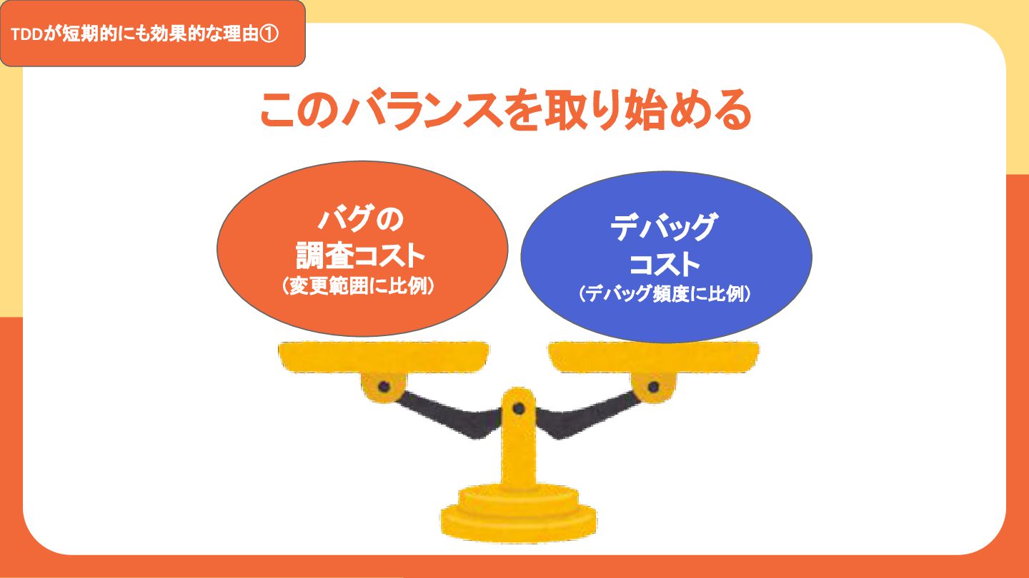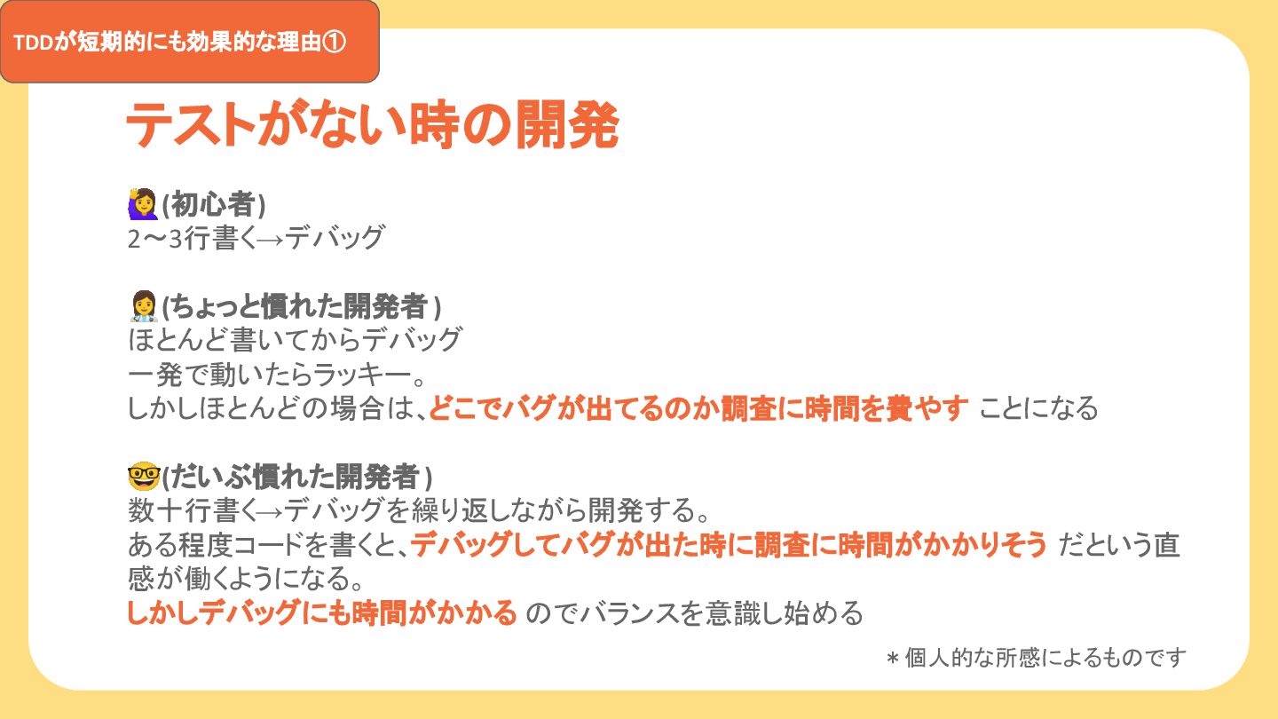 🤓(だいぶ慣れた開発者) 数十行書く→デバッグを繰り返しながら開発する。 ある程度コードを書くと、デバッグしてバグが出た時に調査に時間がかかりそう だという直 感が働くようになる。 しかしデバッグにも時間がかかる のでバランスを意識し始める *個人的な所感によるものです TDDが短期的にも効果的な理由①