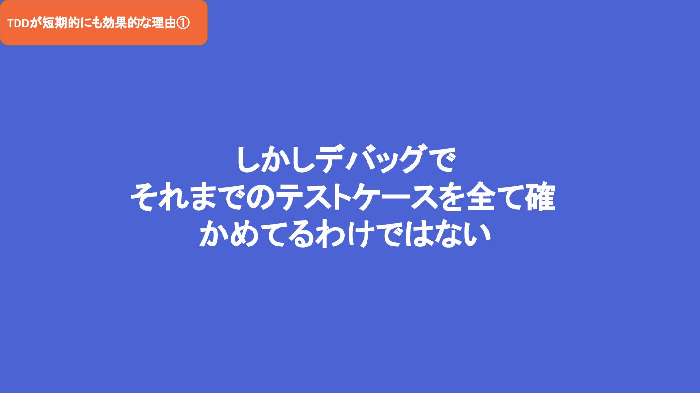 しかしデバッグで それまでのテストケースを全て確 かめてるわけではない TDDが短期的にも効果的な理由①