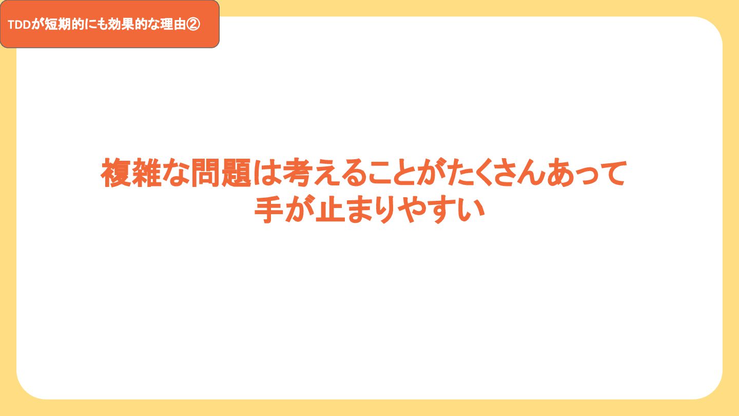 複雑な問題は考えることがたくさんあって 手が止まりやすい TDDが短期的にも効果的な理由②