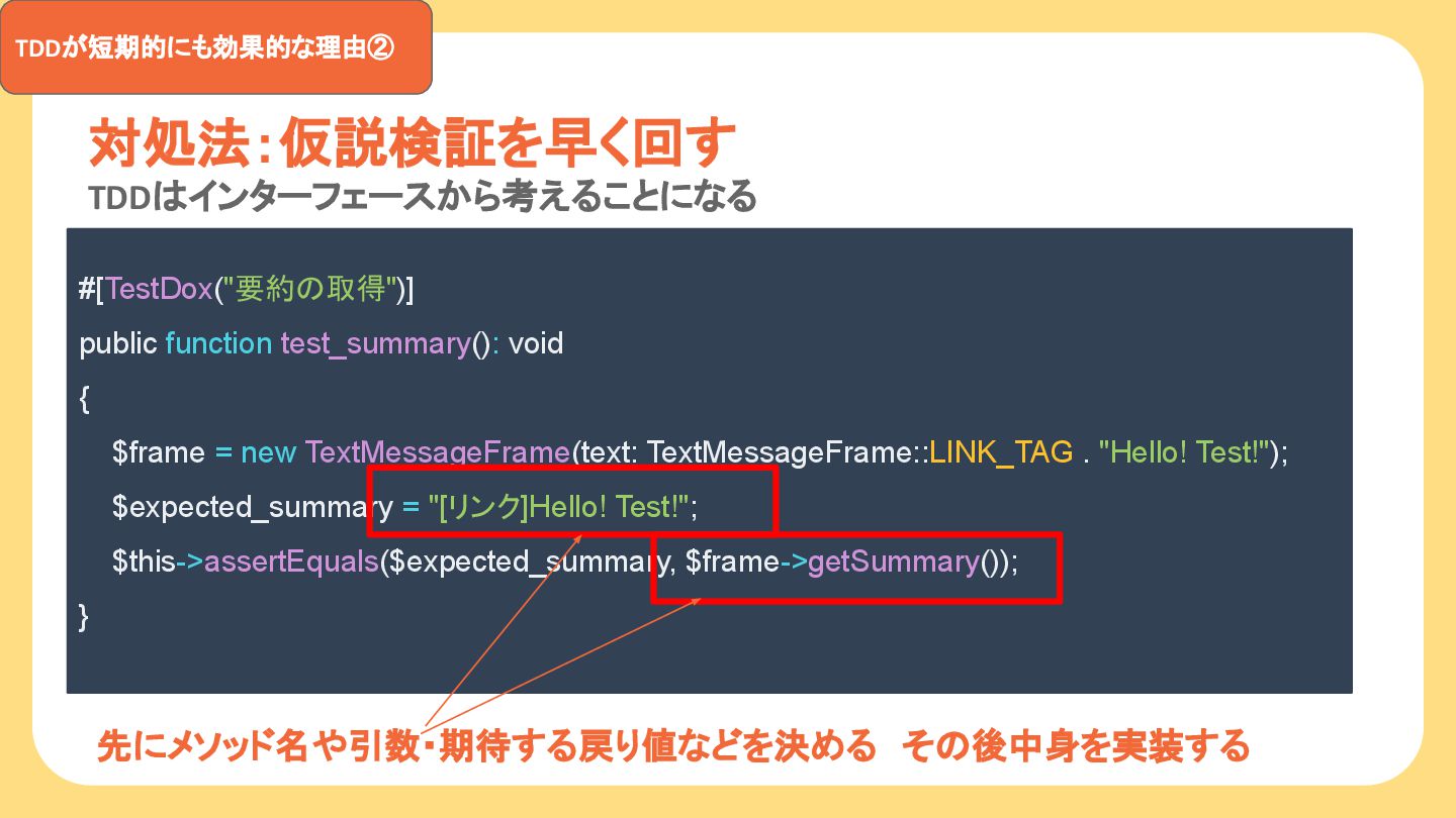 = new TextMessageFrame(text: TextMessageFrame::LINK_TAG . "Hello! Test!"); $expected_summary = "[リンク]Hello! Test!"; $this->assertEquals($expected_summary, $frame->getSummary()); } 先にメソッド名や引数・期待する戻り値などを決める その後中身を実装する TDDはインターフェースから考えることになる TDDが短期的にも効果的な理由②