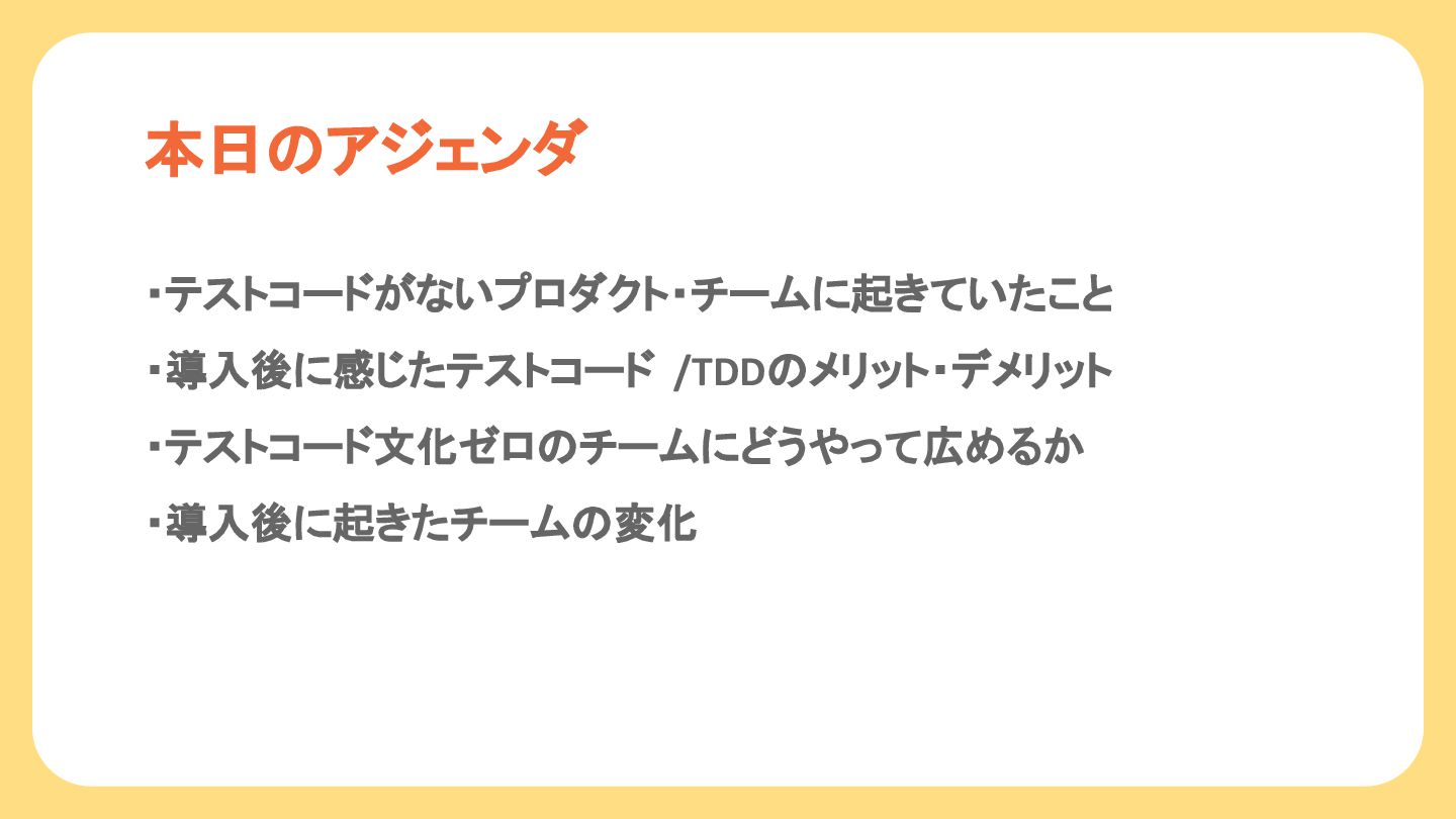 本日のアジェンダ ・テストコードがないプロダクト・チームに起きていたこと ・導入後に感じたテストコード /TDDのメリット・デメリット ・テストコード文化ゼロのチームにどうやって広めるか ・導入後に起きたチームの変化