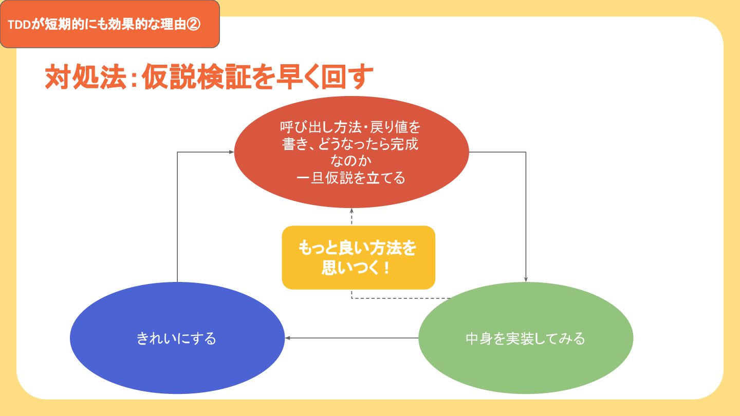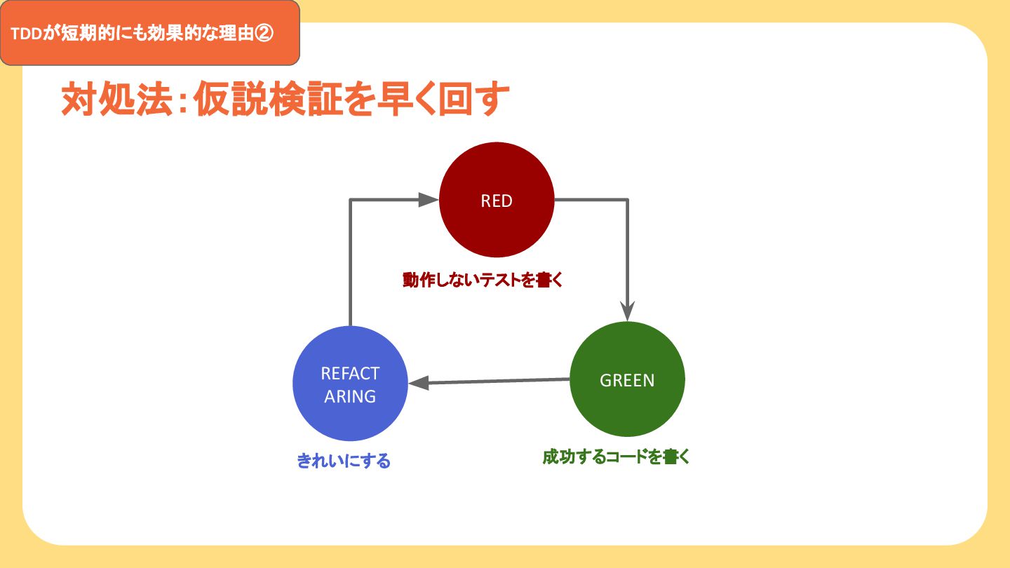 対処法:仮説検証を早く回す TDDが短期的にも効果的な理由② RED GREEN REFACT ARING 成功するコードを書く きれいにする 動作しないテストを書く