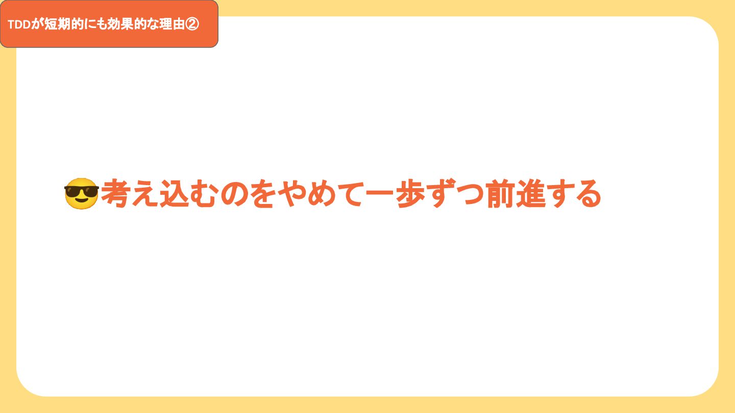 😎考え込むのをやめて一歩ずつ前進する TDDが短期的にも効果的な理由②