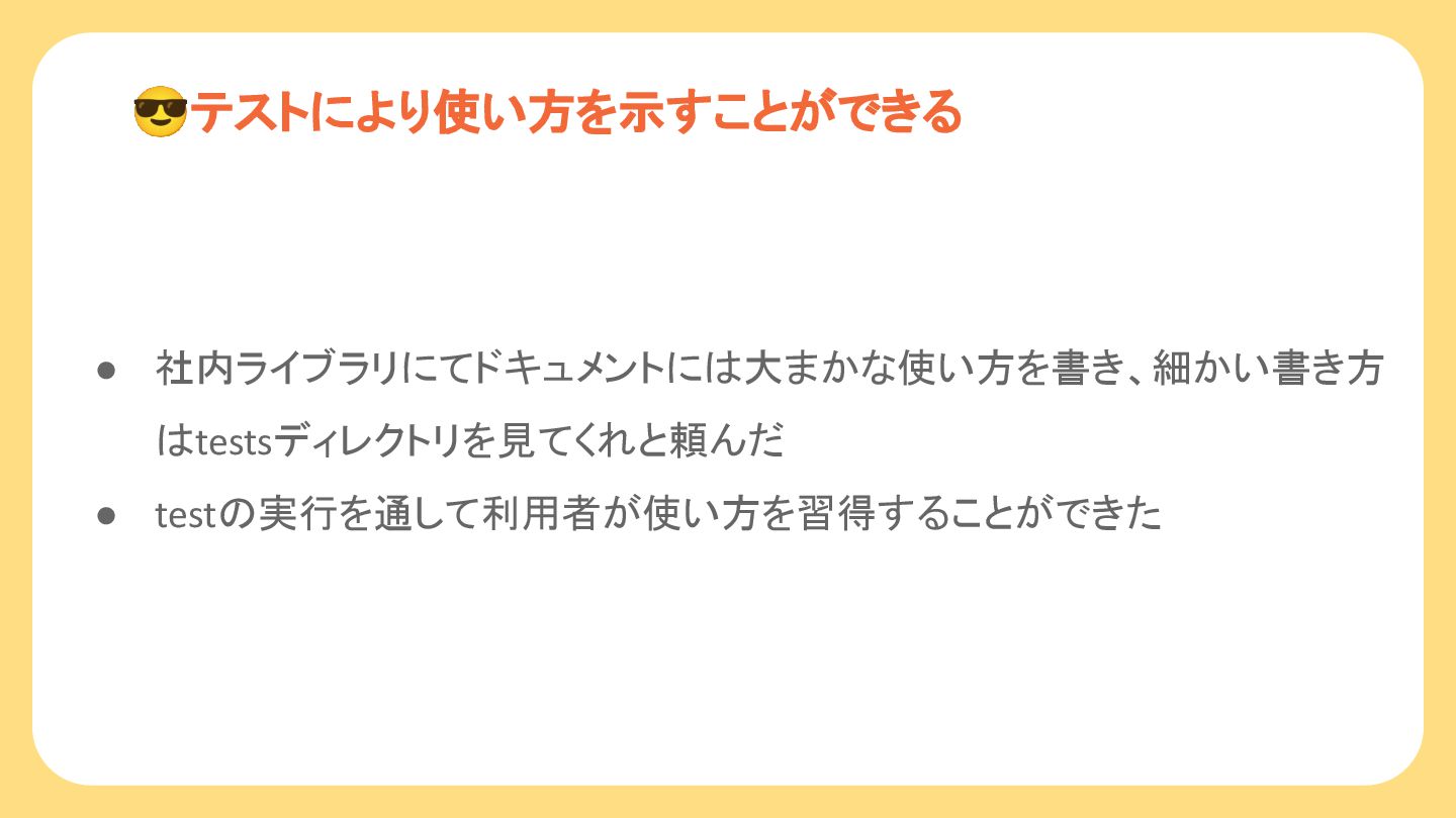 😎テストにより使い方を示すことができる • 社内ライブラリにてドキュメントには大まかな使い方を書き、細かい書き方 はtestsディレクトリを見てくれと頼んだ • testの実行を通して利用者が使い方を習得することができた