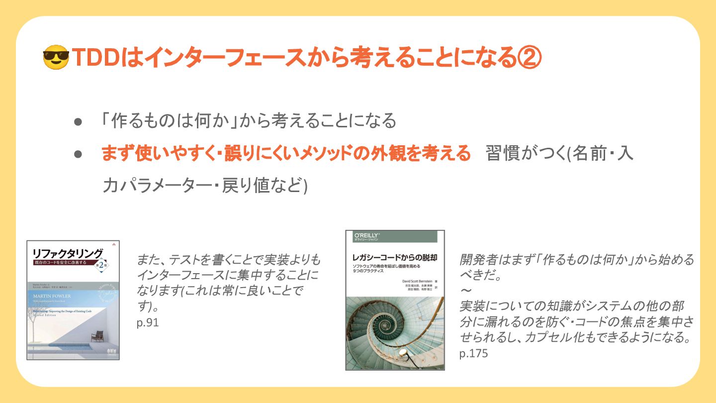 😎TDDはインターフェースから考えることになる② • 「作るものは何か」から考えることになる • まず使いやすく・誤りにくいメソッドの外観を考える 習慣がつく(名前・入 力パラメーター・戻り値など) また、テストを書くことで実装よりも インターフェースに集中することに