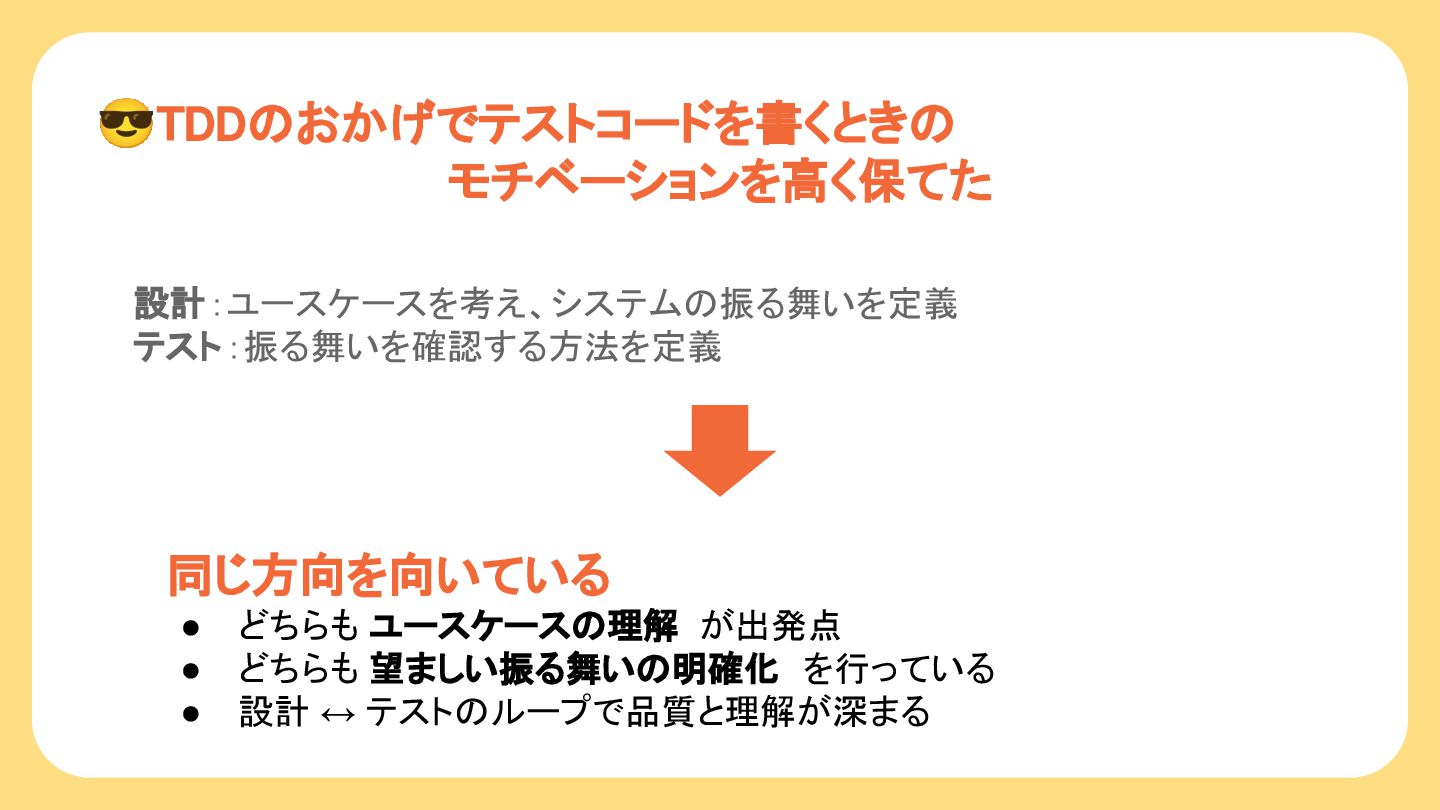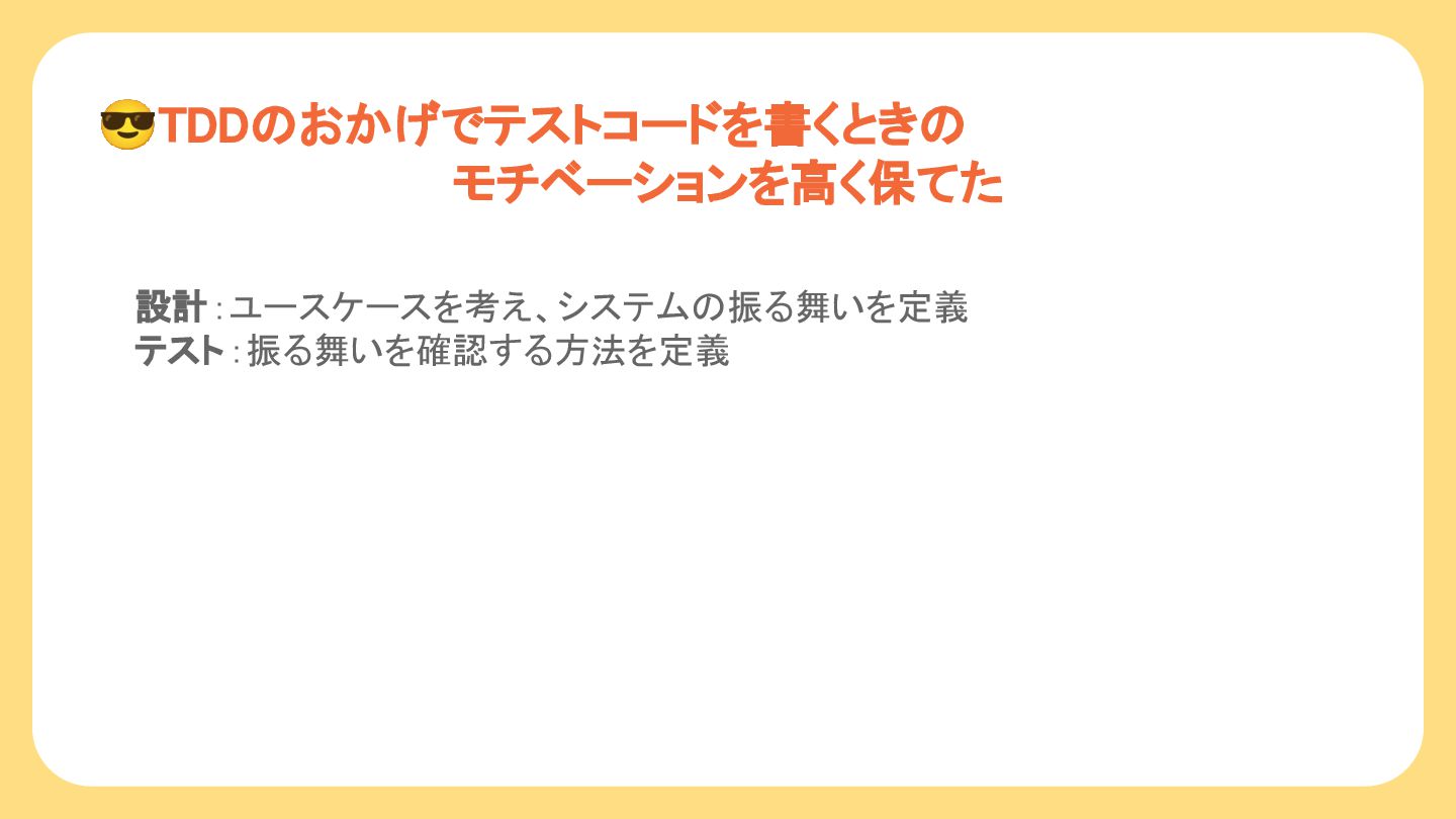 😎TDDのおかげでテストコードを書くときの モチベーションを高く保てた 設計:ユースケースを考え、システムの振る舞いを定義 テスト:振る舞いを確認する方法を定義 同じ方向を向いている • どちらも ユースケースの理解