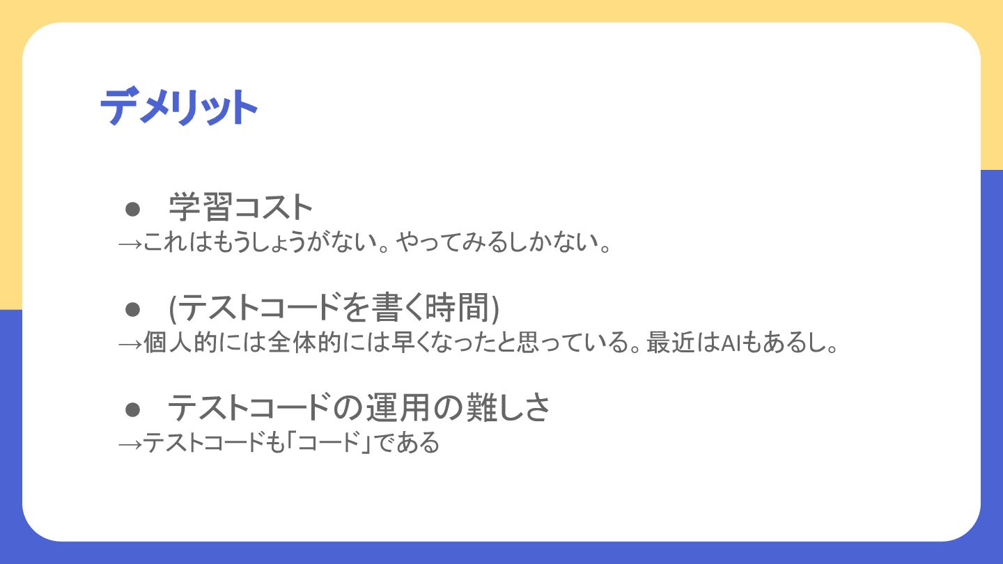 デメリット • 学習コスト →これはもうしょうがない。やってみるしかない。 • (テストコードを書く時間) →個人的には全体的には早くなったと思っている。最近はAIもあるし。 • テストコードの運用の難しさ