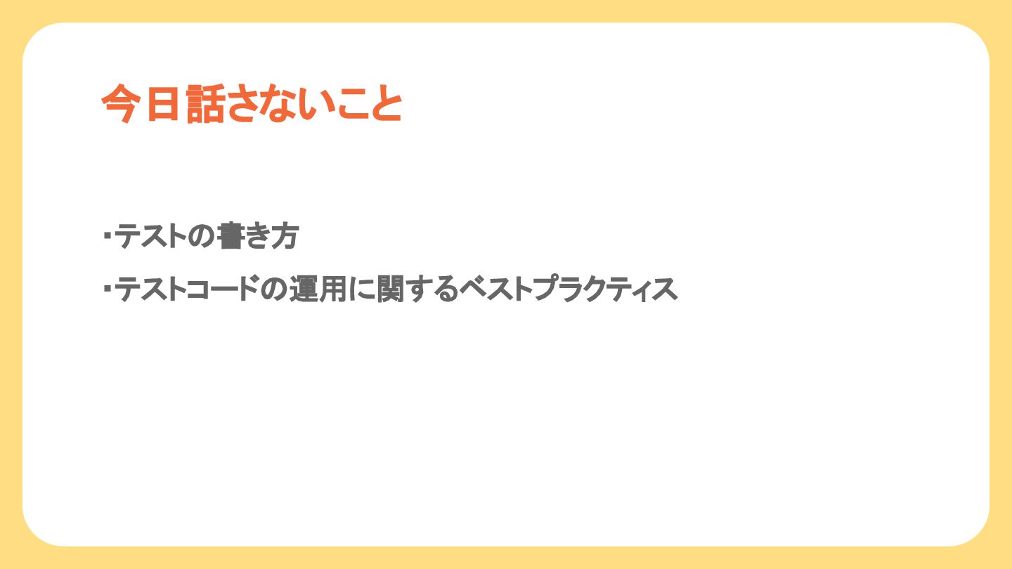 今日話さないこと ・テストの書き方 ・テストコードの運用に関するベストプラクティス
