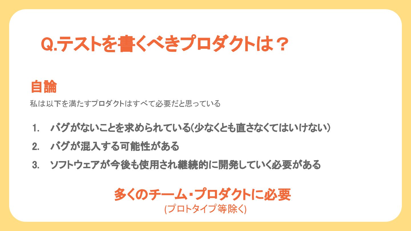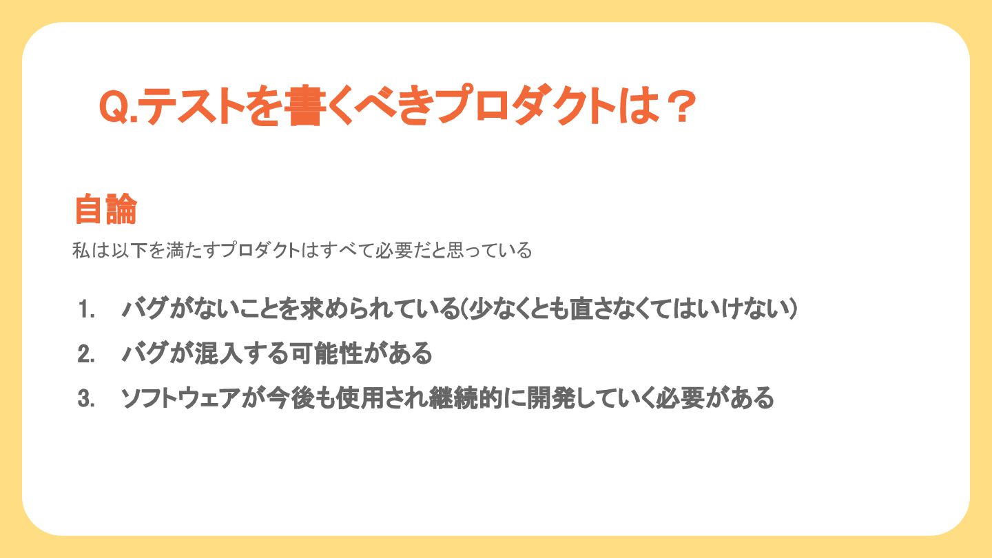 Q.テストを書くべきプロダクトは? 1. バグがないことを求められている(少なくとも直さなくてはいけない) 2. バグが混入する可能性がある 3. ソフトウェアが今後も使用され継続的に開発していく必要がある