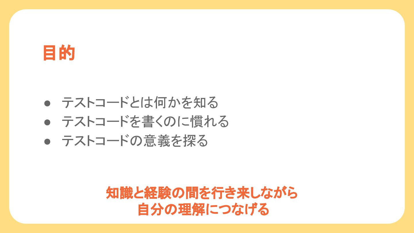目的 • テストコードとは何かを知る • テストコードを書くのに慣れる • テストコードの意義を探る 知識と経験の間を行き来しながら 自分の理解につなげる