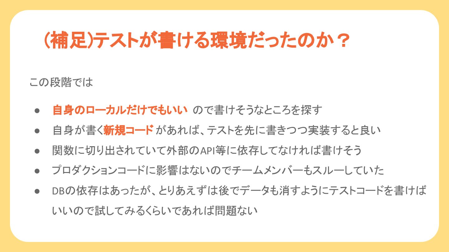 関数に切り出されていて外部のAPI等に依存してなければ書けそう • プロダクションコードに影響はないのでチームメンバーもスルーしていた • DBの依存はあったが、とりあえずは後でデータも消すようにテストコードを書けば いいので試してみるくらいであれば問題ない