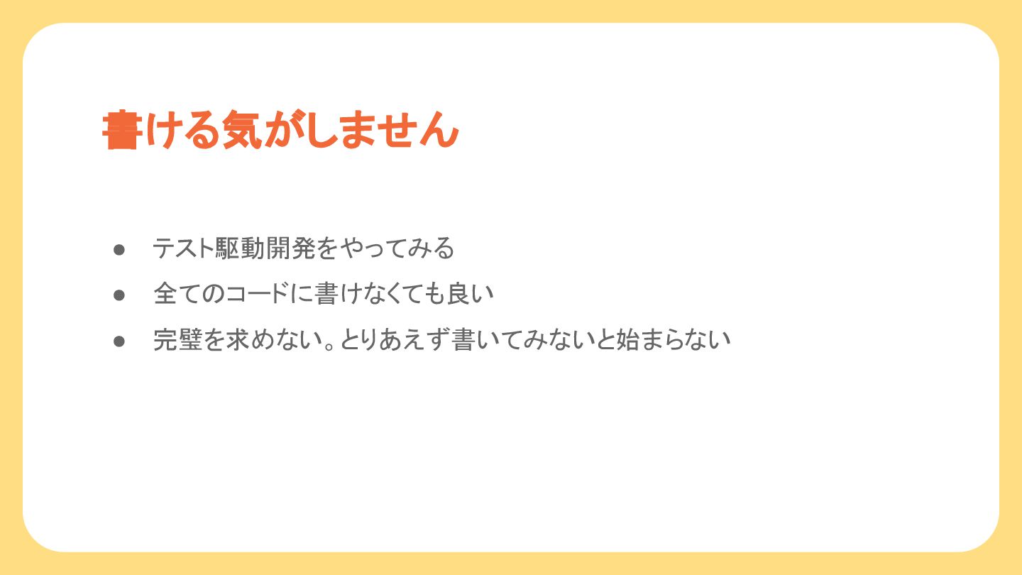 書ける気がしません • テスト駆動開発をやってみる • 全てのコードに書けなくても良い • 完璧を求めない。とりあえず書いてみないと始まらない