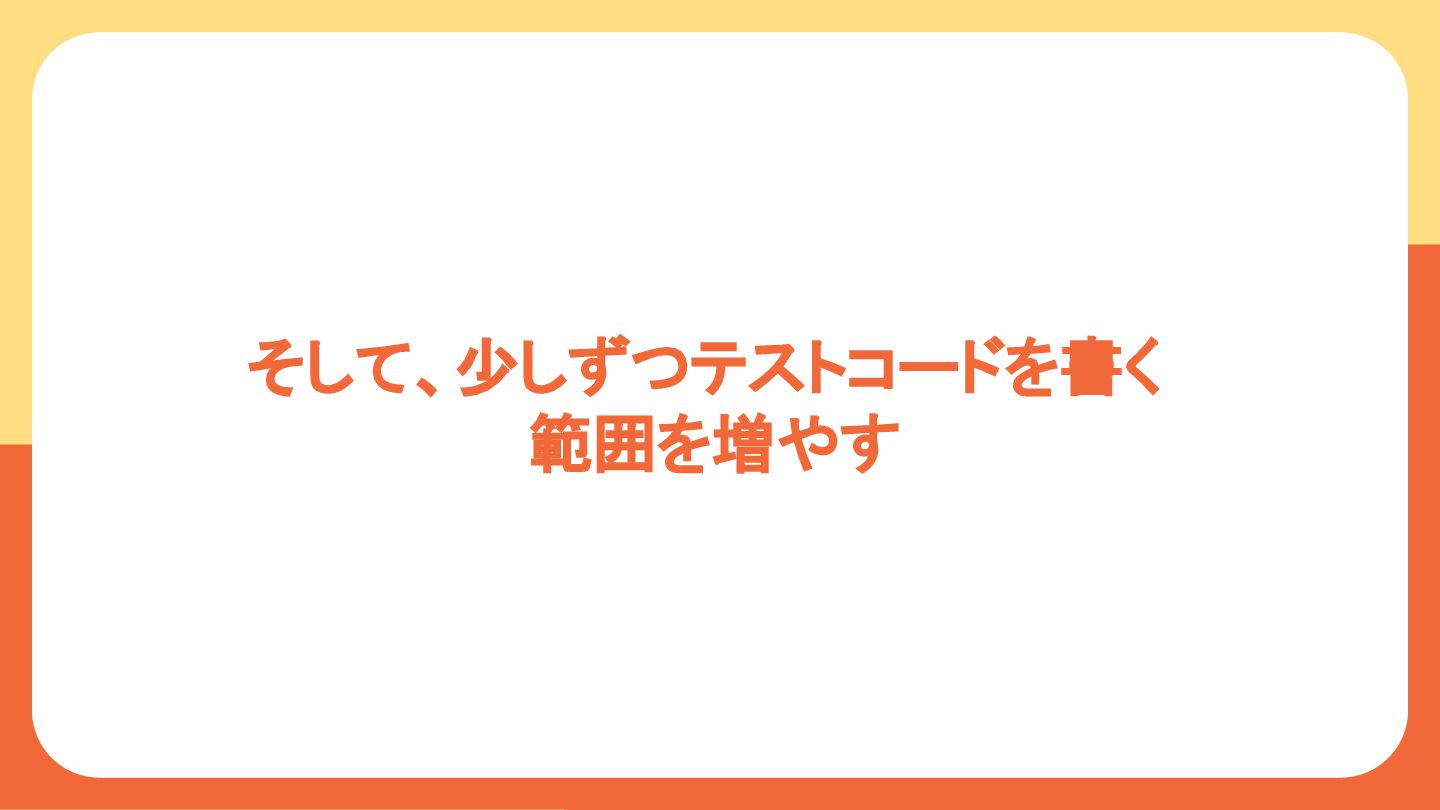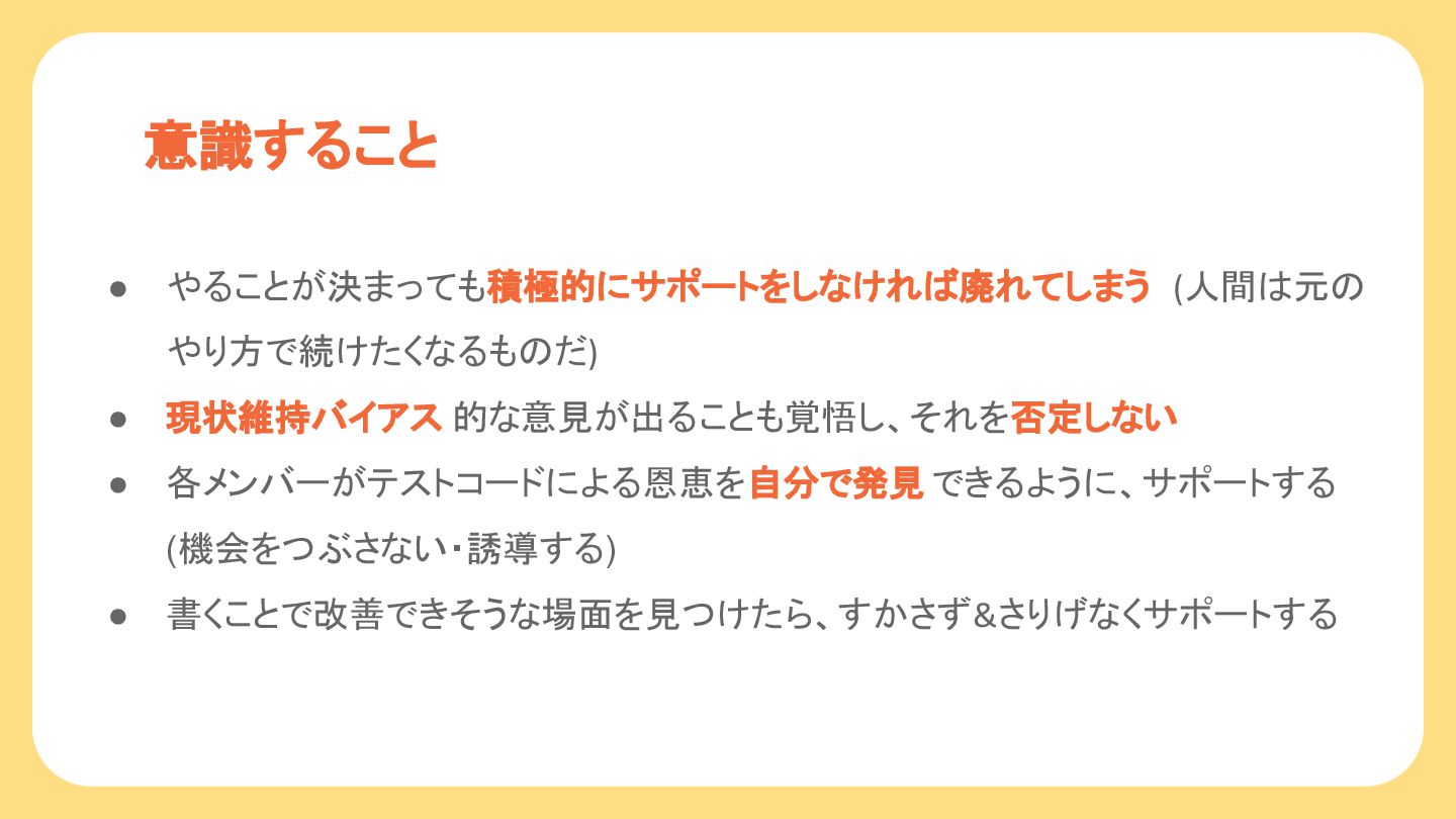 各メンバーがテストコードによる恩恵を自分で発見 できるように、サポートする (機会をつぶさない・誘導する) • 書くことで改善できそうな場面を見つけたら、すかさず&さりげなくサポートする
