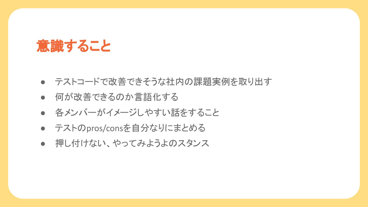 意識すること • テストコードで改善できそうな社内の課題実例を取り出す • 何が改善できるのか言語化する • 各メンバーがイメージしやすい話をすること • テストのpros/consを自分なりにまとめる