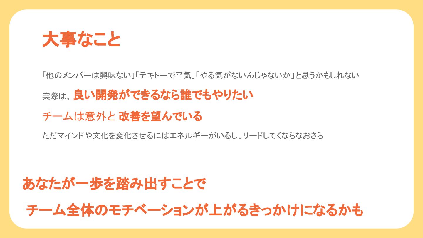 大事なこと 「他のメンバーは興味ない」「テキトーで平気」「やる気がないんじゃないか」と思うかもしれない 実際は、良い開発ができるなら誰でもやりたい チームは意外と 改善を望んでいる ただマインドや文化を変化させるにはエネルギーがいるし、リードしてくならなおさら あなたが一歩を踏み出すことで チーム全体のモチベーションが上がるきっかけになるかも