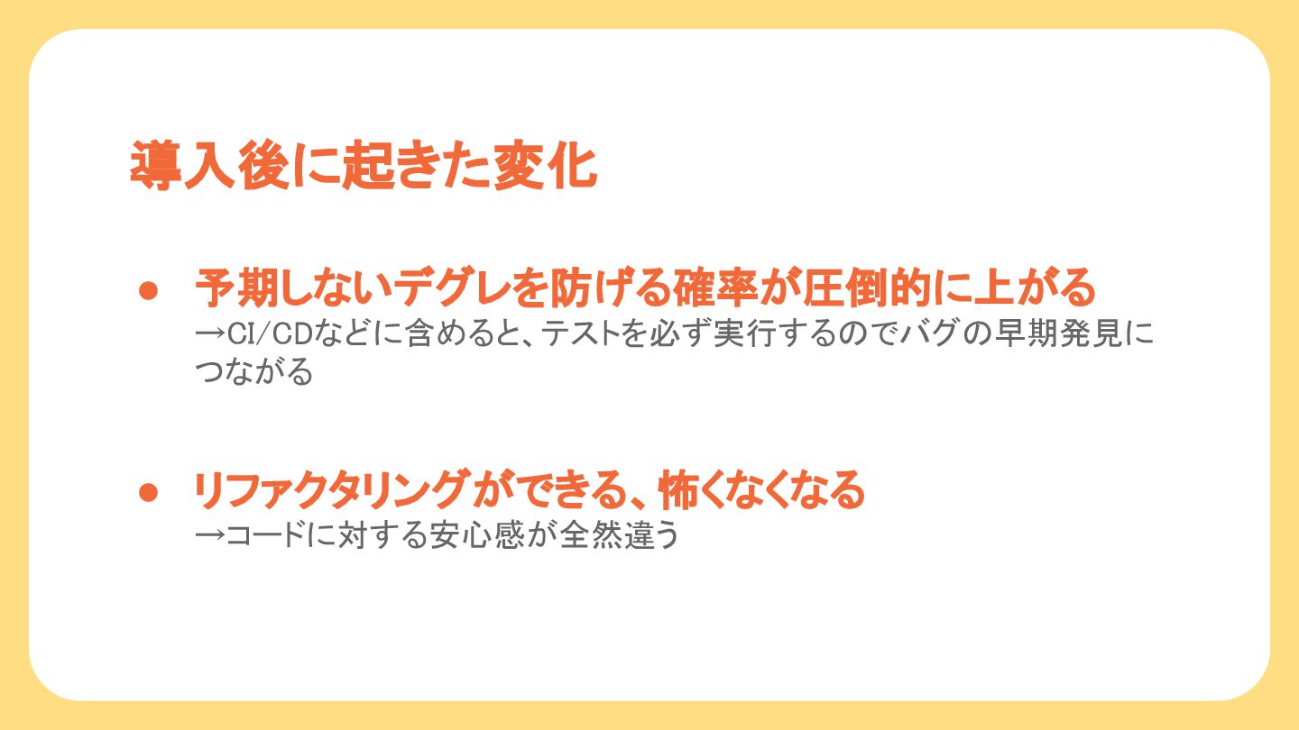 導入後に起きた変化 • 予期しないデグレを防げる確率が圧倒的に上がる →CI/CDなどに含めると、テストを必ず実行するのでバグの早期発見に つながる • リファクタリングができる、怖くなくなる