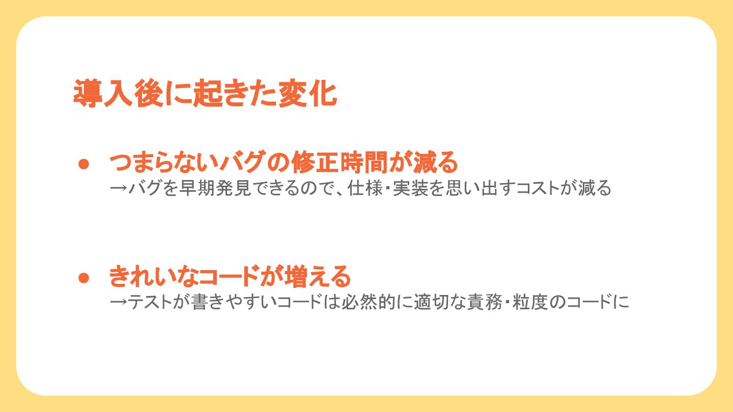 導入後に起きた変化 • つまらないバグの修正時間が減る →バグを早期発見できるので、仕様・実装を思い出すコストが減る • きれいなコードが増える →テストが書きやすいコードは必然的に適切な責務・粒度のコードに