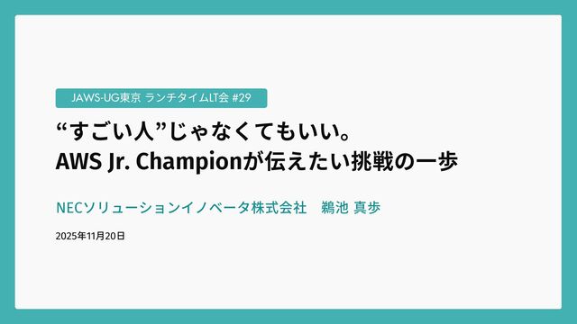 “すごい人”じゃなくてもいい。 AWS Jr. Championが伝えたい挑戦の一歩 2025年11月20日 NECソリューションイノベータ株式会社 鵜池 真歩 JAWS-UG 東京 ランチタイムLT