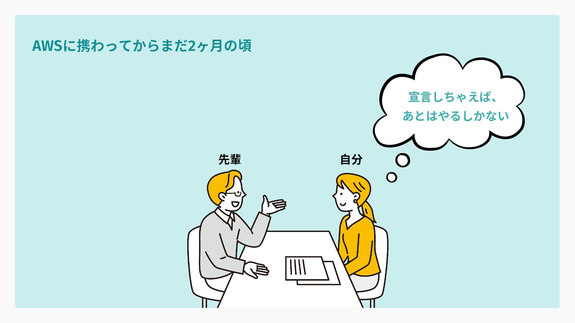 宣言しちゃえば、 あとはやるしかない AWSに携わってからまだ2ヶ月の頃 先輩 自分