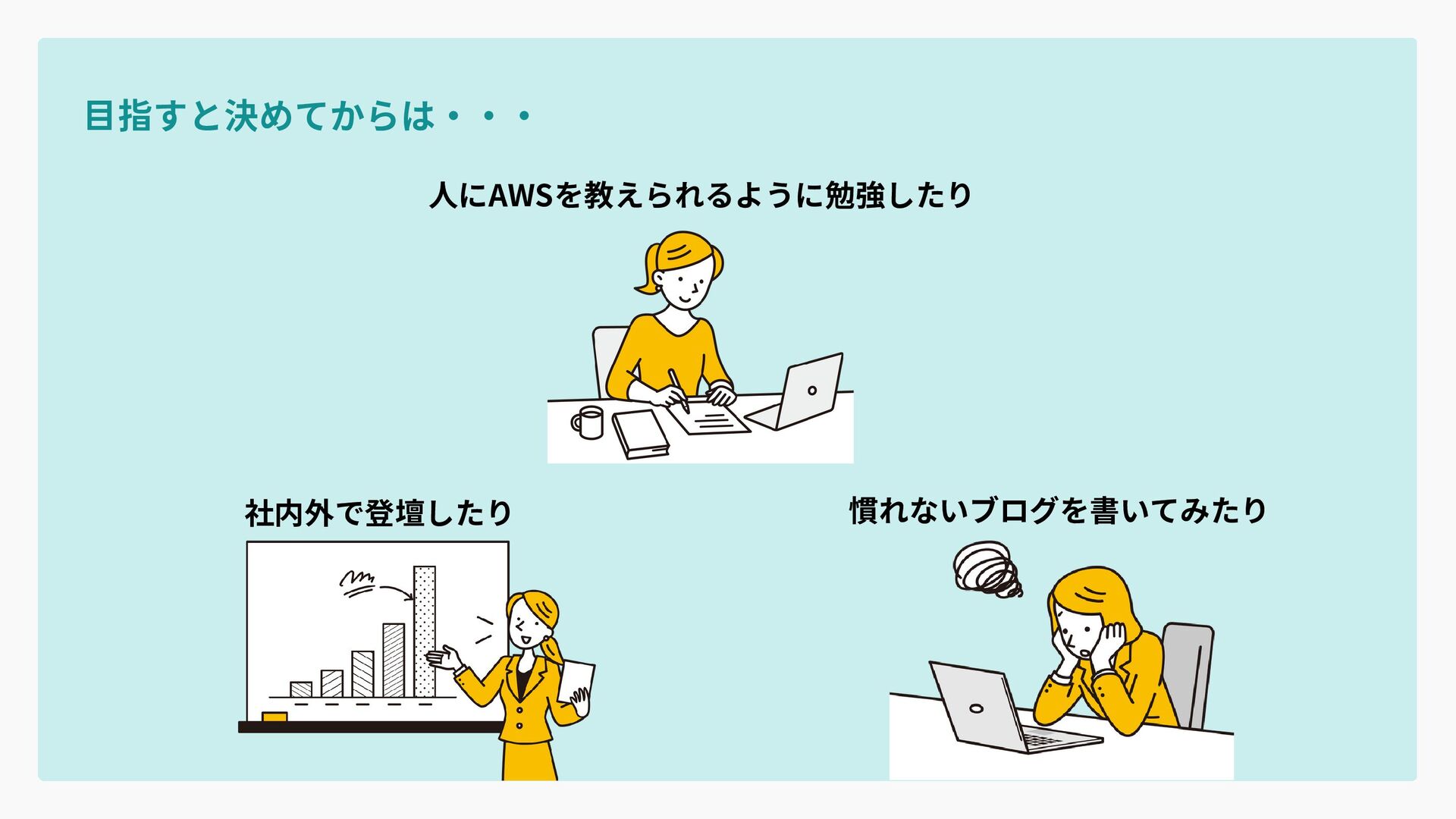 目指すと決めてからは・・・ 社内外で登壇したり 慣れないブログを書いてみたり 人にAWSを教えられるように勉強したり