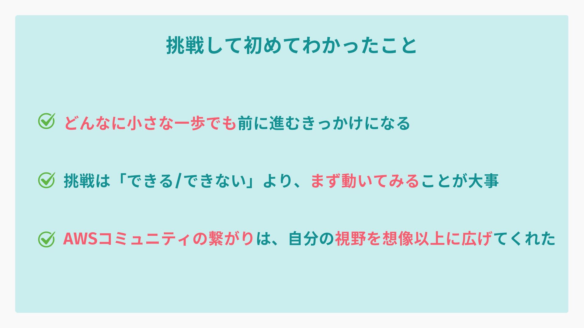 挑戦して初めてわかったこと どんなに小さな一歩でも前に進むきっかけになる 挑戦は「できる/できない」より、まず動いてみることが大事 AWSコミュニティの繋がりは、自分の視野を想像以上に広げてくれた
