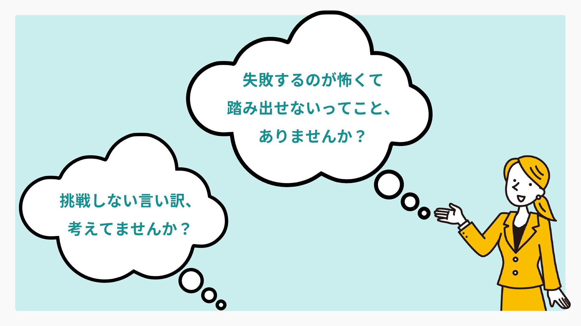 失敗するのが怖くて 踏み出せないってこと、 ありませんか? 挑戦しない言い訳、 考えてませんか?