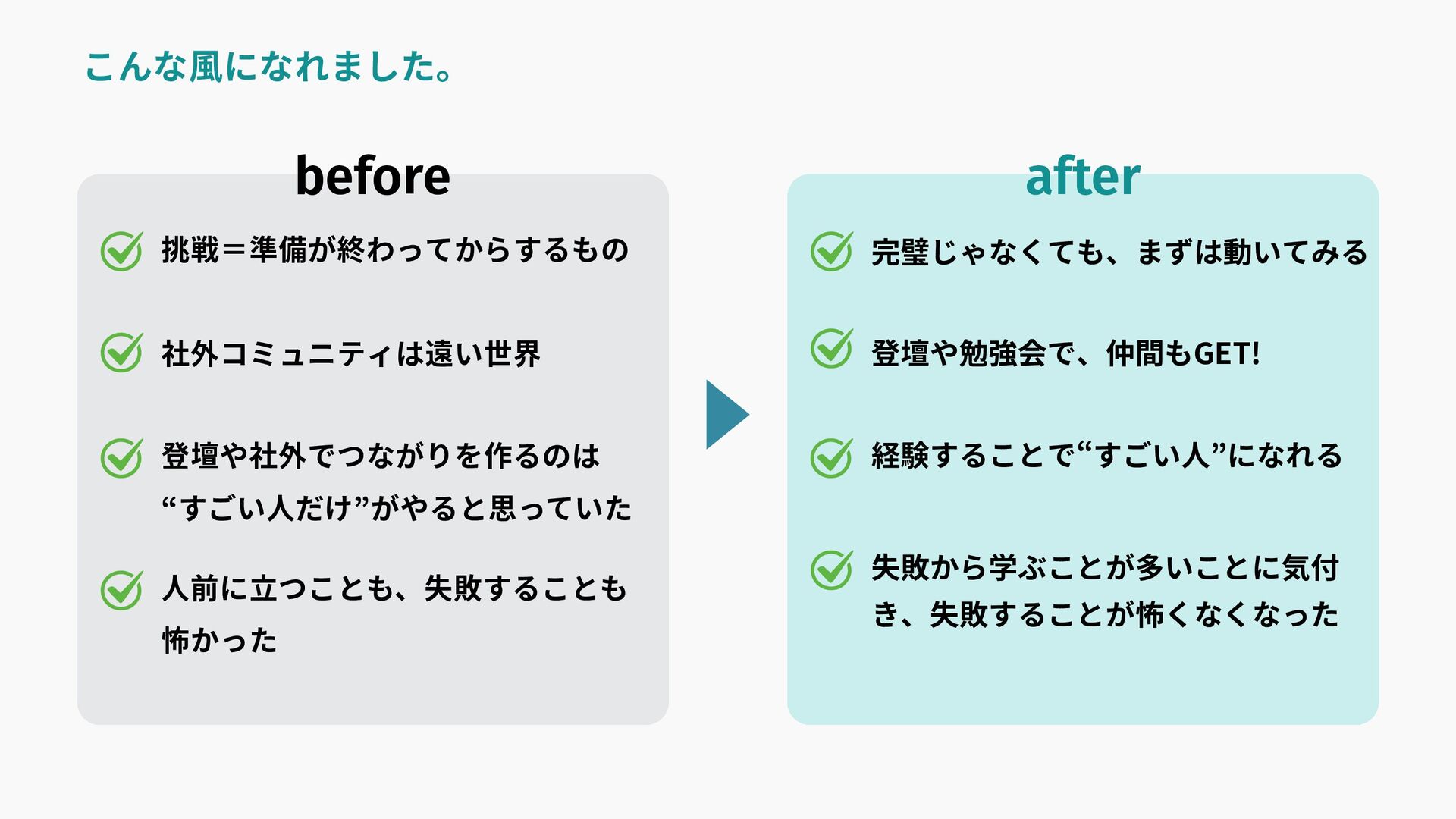 こんな風になれました。 before after 社外コミュニティは遠い世界 登壇や社外でつながりを作るのは “すごい人だけ”がやると思っていた 挑戦=準備が終わってからするもの 完璧じゃなくても、まずは動いてみる 登壇や勉強会で、仲間もGET! 経験することで“すごい人”になれる
