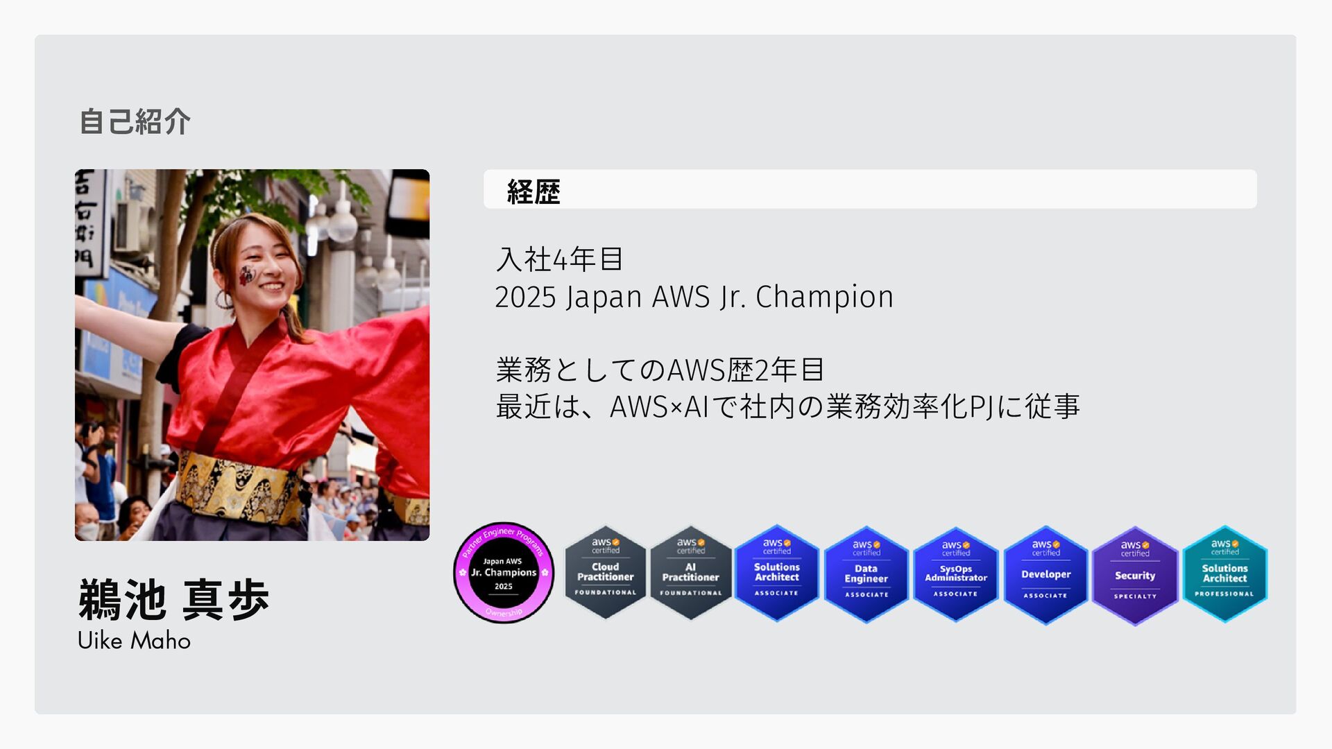 経歴 入社4年目 2025 Japan AWS Jr. Champion 業務としてのAWS歴2年目 最近は、AWS×AIで社内の業務効率化PJに従事 鵜池