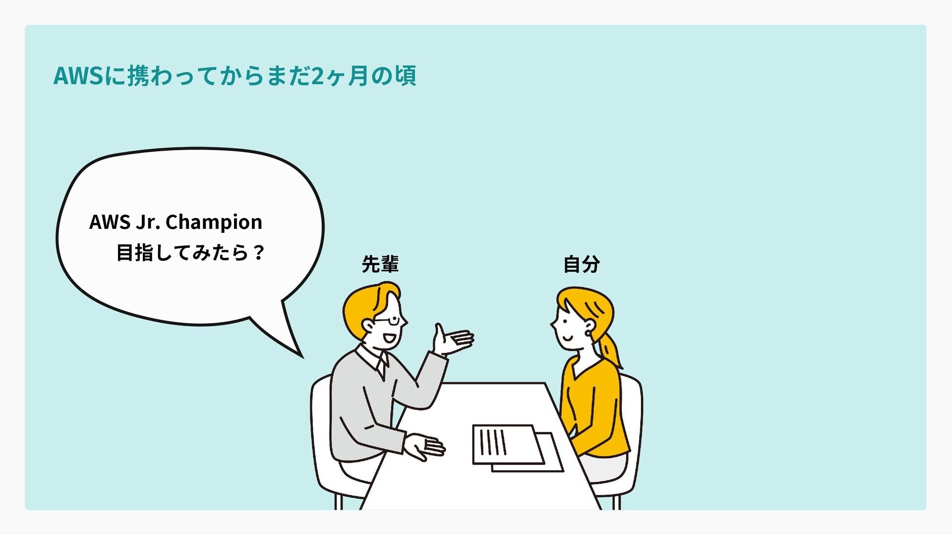 AWS Jr. Champion 目指してみたら? AWSに携わってからまだ2ヶ月の頃 先輩 自分