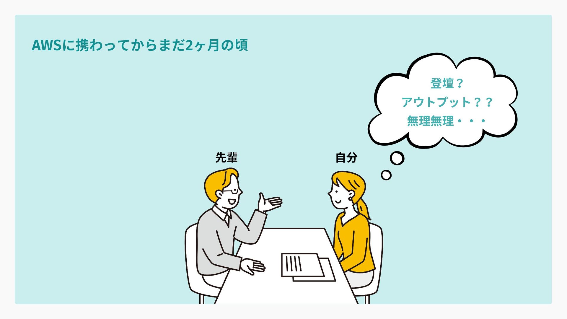 登壇? アウトプット?? 無理無理・・・ AWSに携わってからまだ2ヶ月の頃 先輩 自分
