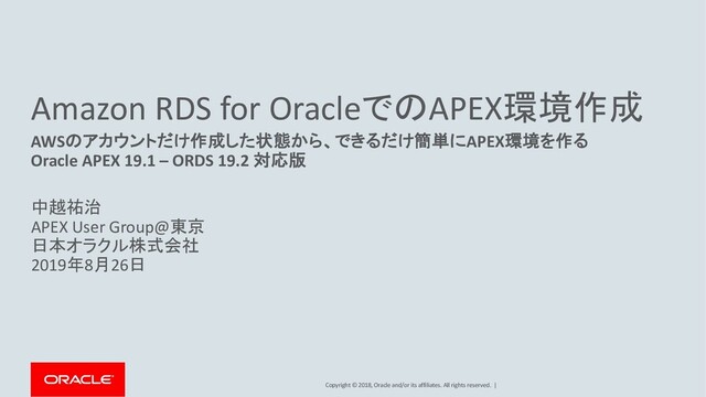 | ORDSインストール・ユーザーの構成 exec rdsadmin.rdsadmin_util.grant_sys_object('DBA_OBJECTS', 'master_user', 'SELECT', true); exec rdsadmin.rdsadmin_util.grant_sys_object('DBA_ROLE_PRIVS', 'master_user', 'SELECT', true); exec rdsadmin.rdsadmin_util.grant_sys_object('DBA_TAB_COLUMNS', 'master_user', 'SELECT', true); exec rdsadmin.rdsadmin_util.grant_sys_object('USER_CONS_COLUMNS', 'master_user', 'SELECT', true); exec rdsadmin.rdsadmin_util.grant_sys_object('USER_CONSTRAINTS', 'master_user', 'SELECT', true); exec rdsadmin.rdsadmin_util.grant_sys_object('USER_OBJECTS', 'master_user', 'SELECT', true); exec rdsadmin.rdsadmin_util.grant_sys_object('USER_PROCEDURES', 'master_user', 'SELECT', true); exec rdsadmin.rdsadmin_util.grant_sys_object('USER_TAB_COLUMNS', 'master_user', 'SELECT', true); exec rdsadmin.rdsadmin_util.grant_sys_object('USER_TABLES', 'master_user', 'SELECT', true); exec rdsadmin.rdsadmin_util.grant_sys_object('USER_VIEWS', 'master_user', 'SELECT', true); exec rdsadmin.rdsadmin_util.grant_sys_object('USER_VIEWS', 'master_user', 'SELECT', true); exec rdsadmin.rdsadmin_util.grant_sys_object('WPIUTL', 'master_user', 'EXECUTE', true); マスター・ユーザーにてORDSのセットアップを行うため、必要な権限を割り与える。 マスター・ユーザーは大文字で指定する。 最後のWPIUTLのEXECUTE権限は、AWSのマニュアルに記載がなく、ORDS 19.2 の セットアップの際に追加で必要だった。