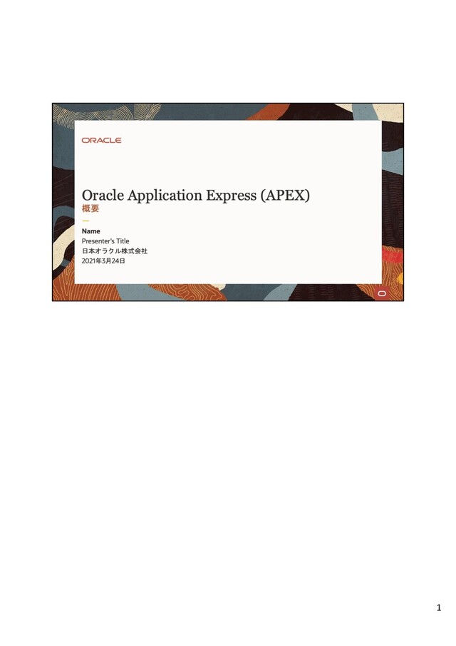 Databaseの サービスがあります。これには無償利⽤可能なAlways Freeのサービスも含み ます。また、⼤規模の実装に適したExadata Cloud Service上でも利⽤可能です。 Oracle APEXはオラクル・データベースより、頻繁(ひんぱん)に更新がリリース されています。最新バージョンはOracleのソフトウェア・ダウンロード・サイ ト(https://apex.oracle.com/download/)にあるOracle APEXのページから⼊⼿して ください。 8