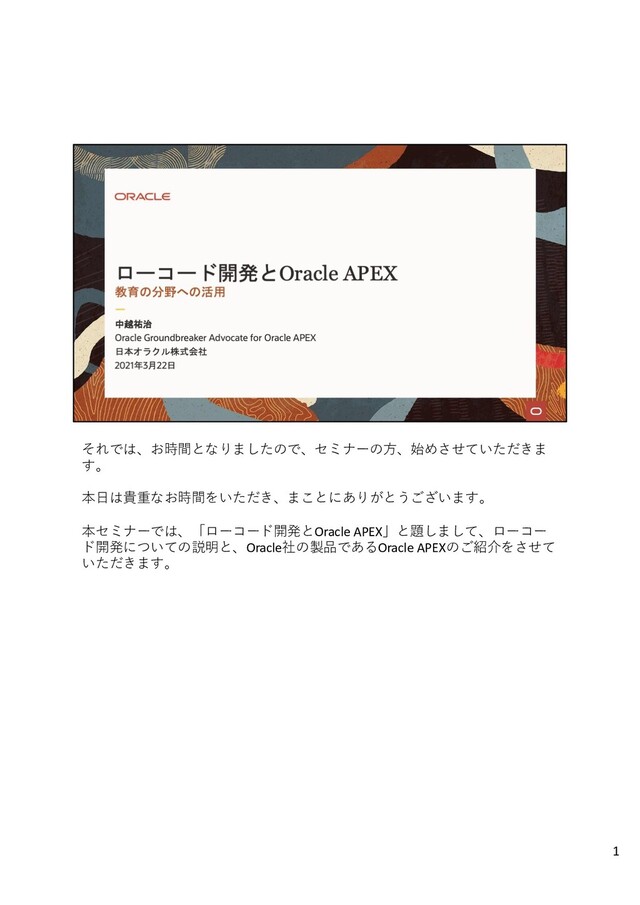 2021年4月19日に、Oracle Academyの会員を対象にOracle APEXの紹介を行いました。その際に使用した資料のスライドと話した内容です。